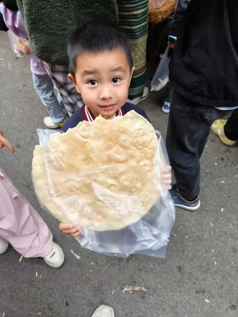 最讓我驚豔的是在橄欖壩趕擺的時候,吃到了一種很薄的餅,不知道具體叫什麼名字,香脆可口,餅的分量很大價格還很便宜,我們家小孩一個人就把一整個吃完了。