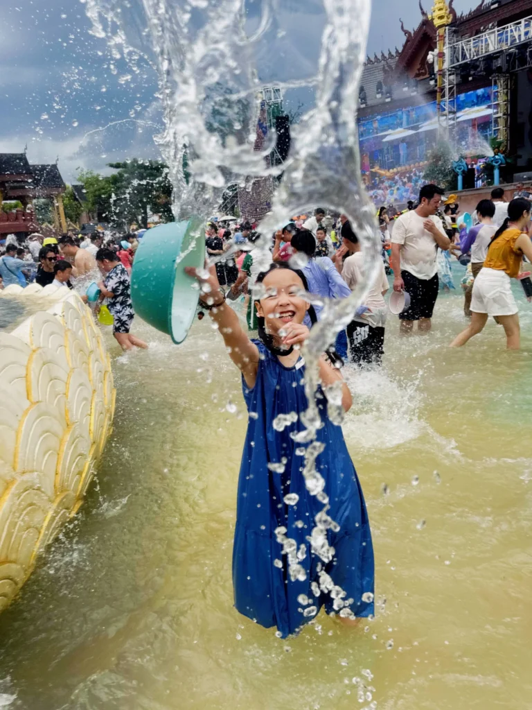 在快節奏的現代生活中,傣族園潑水廣場為遊客提供了一個釋放壓力、放鬆身心的理想場所。當清冽的水花潑灑在身上,伴隨著現場熱烈的音樂與歡笑聲,所有的煩惱與疲憊都會隨之消散。這裡沒有身份的差異、沒有年齡的界限,來自五湖四海的人們因水結緣,相互潑灑、相互祝福,在狂歡中收穫真摯的快樂。