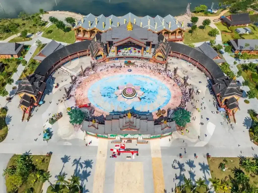 傣族園潑水廣場坐落於西雙版納傣族自治州景洪市勐罕鎮(俗稱橄欖壩)的傣族園景區內,是景區的核心景點與文化體驗中心。傣族園由曼將、曼春滿、曼乍、曼嘎、曼聽五個保存完好的傣族自然村寨組成,總面積達336公頃,而潑水廣場就處於這五個村寨的中心地帶,佔地面積約8000平方米,可同時容納上萬人參與潑水活動。廣場四周環繞著茂密的椰林、棕櫚樹與三角梅,充滿濃鬱的熱帶風情;廣場中央設有大型噴水裝置與祈福壇,四周則鋪設防滑地面,並配套有更衣室、儲物櫃、休息區等基礎設施,為遊客提供便捷的體驗條件。