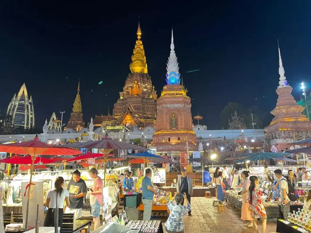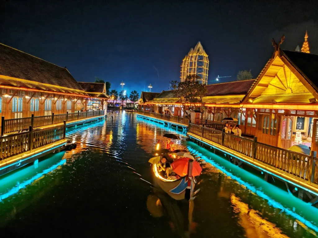 在景觀價值上,告莊西雙景實現了傣泰建築與熱帶自然景觀的完美融合,處處皆是風景。核心景觀以九塔十二寨為骨架,佛塔雄偉莊嚴,傣家竹樓錯落有致,紅磚黛瓦間點綴著熱帶棕櫚與芭蕉樹,充滿熱帶雨林的濃鬱氣息。大金塔作為景區的標誌性建築,金燦奪目,無論從哪個角度拍攝都極具衝擊力,是遊客打卡的必到之處;湄公河・星光夜市則是大金三角區域最大規模、最具特色的夜市,夜幕降臨後,萬盞燈光亮起,與瀾滄江的夜色交相輝映,形成 “燈光鋪滿江岸,烟火氣貫穿全區” 的獨特景觀;湄公河人家・六国城匯聚了中、老、緬、越、泰、柬六国特色建築,干欄式、佛塔式、石壁式建築錯落分佈,一步一景間仿佛走過整個東南亞。此外,瀾滄江濱江步道風光秀麗,吹著江風賞著落日,可盡享熱帶邊境的休閒與浪漫。