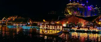 逛完星光夜市,千萬不要錯過旁邊的六国水上市場。這是國內首個具有東南亞風情的水上市場,遊客可以泛舟河上,欣賞兩岸燈火輝煌的建築,感受 “船在水中行,人在畫中游” 的浪漫。市場內的攤位大多設在水邊,販賣著各種特色小吃與工藝品,你可以停靠岸邊,買一份小吃,與當地人閒聊,體驗最真實的東南亞生活氣息。此外,夜間的放河燈活動同樣值得體驗,點亮一盞水燈,許下美好願望,看著燈光隨波遠去,溫馨而治愈。