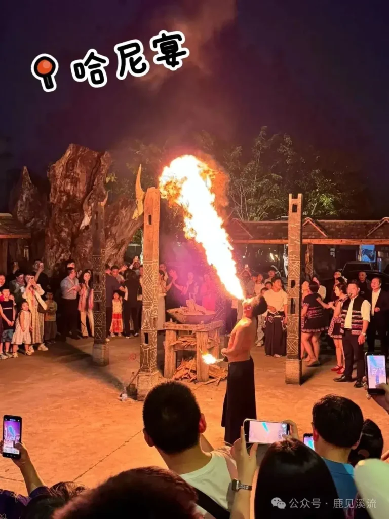 吃完飯還可以參加蹦傣迪、看特色表演,弟弟第一次看噴火表演,看得目不轉睛。