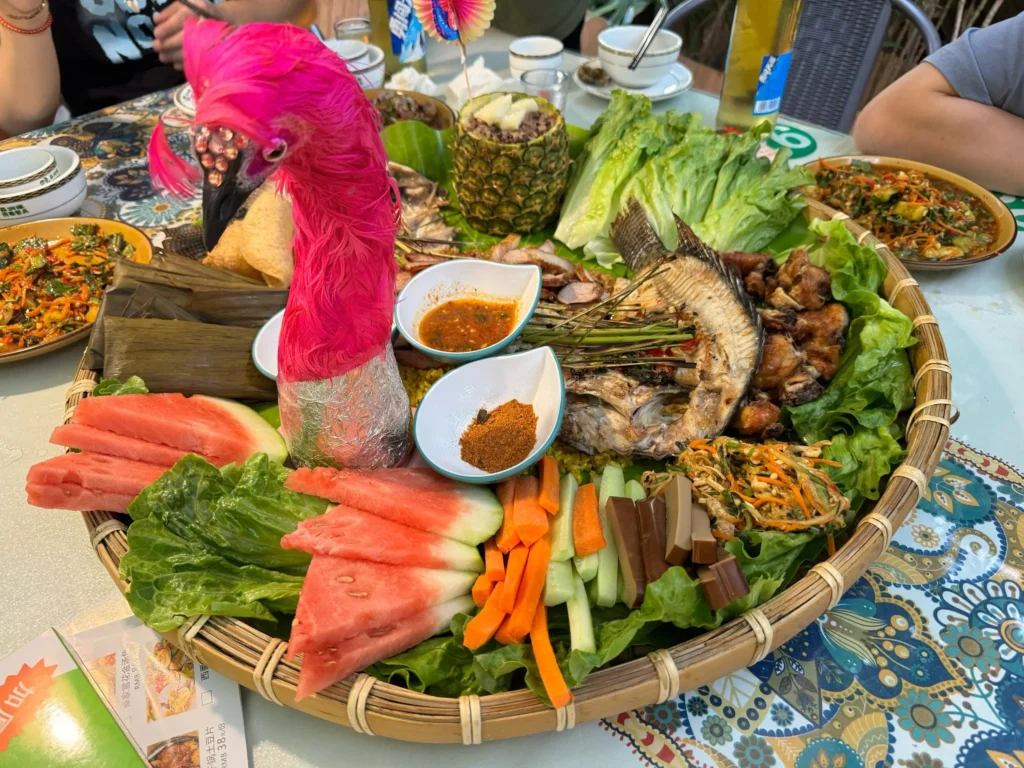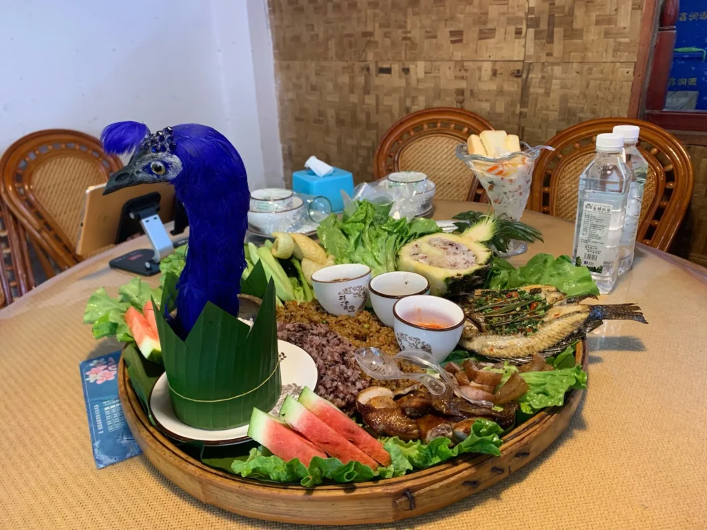 第二天我們去了傣族園,參加完潑水狂歡後,在園附近的一家傣味餐館吃手抓飯。那個竹簸箕端開的瞬間,我們都驚呆了,各種菜品擺成孔雀開屏的造型,拍照超級出片。用手抓著糯米饭搭配烤鸡、酸笋炒肉,酸辣香甜的味道在嘴裡爆發,真的太過癮了。老闆是當地傣族阿姨,看到我們吃得開心,還額外贈送了我們一份自家做的腌木瓜,酸辣爽口,開胃極了。