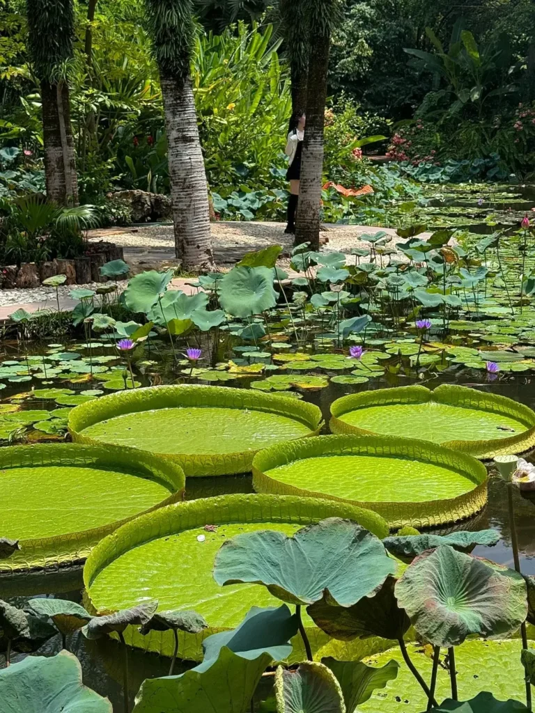 西雙版納植物園的自然景觀價值,在於其匯聚了熱帶雨林的多樣性與獨特性。這裡不僅有數萬種熱帶植物構成的綠色王國,更有眾多令人歎為觀止的自然奇觀。在水生植物園,巨型王蓮如綠色圓桌浮於水面,葉片邊緣上卷,宛如天然的小船,孩童坐於其上,既能感受自然的神奇,又能拍出獨具特色的照片,成為園區最受歡迎的打卡點之一。溝谷雨林區的絞殺榕景觀同樣震撼,榕樹種子在宿主樹上萌發後,氣生根逐漸纏繞宿主,不斷爭奪養分與水分,最終取代宿主,形成”樹中樹”的獨特景象,百年絞殺榕的樹洞甚至可容納多人站立,近距離感受自然力量的殘酷與神奇。