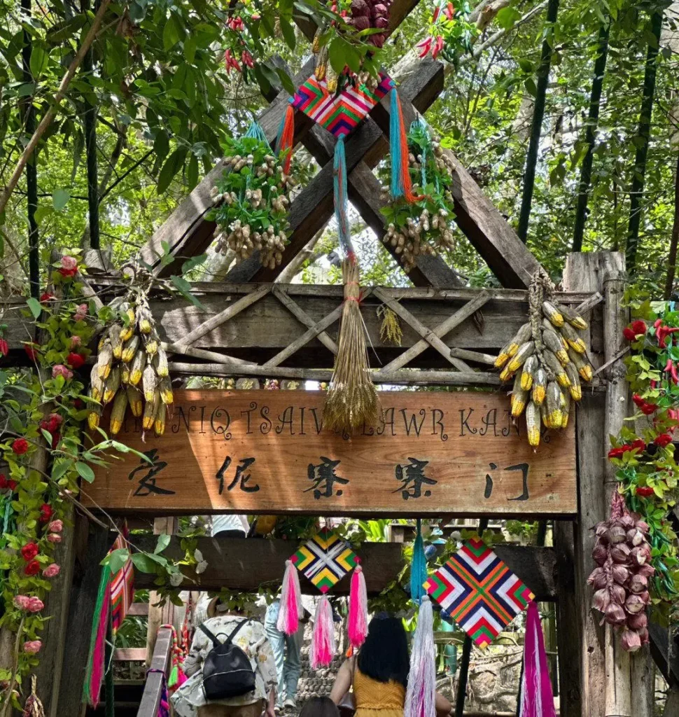 第四步:走過“許願橋”,橋上掛滿了紅色的許願木牌,遊客可在橋口購買木牌,寫下自己的願望掛在橋上;走過許願橋便到達“愛伲山寨”,遊覽山寨內的傳統民居、民俗介紹館,感受哈尼族的風情文化,山寨內有不少賣手工藝品、當地特產的攤位,可根據需求選購。